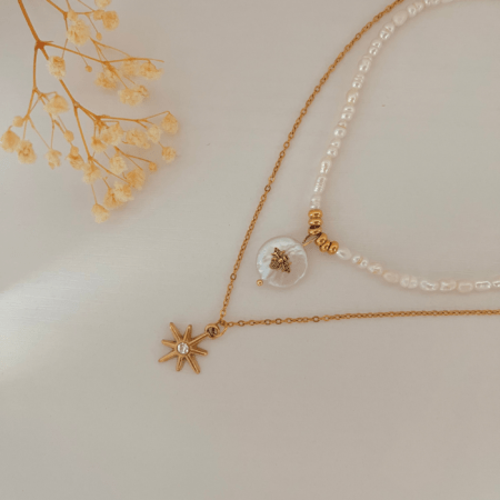 Add a touch of timeless elegance to your wardrobe with our stunning natural pearl necklace set. Perfect for any occasion, this versatile set effortlessly enhances your boho chic style with its multiple layers and stacked chains.