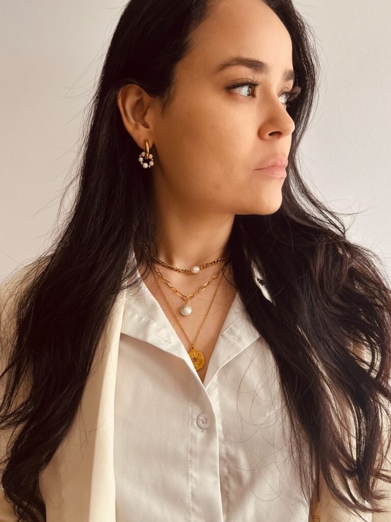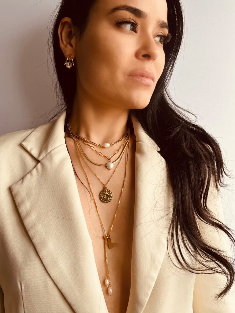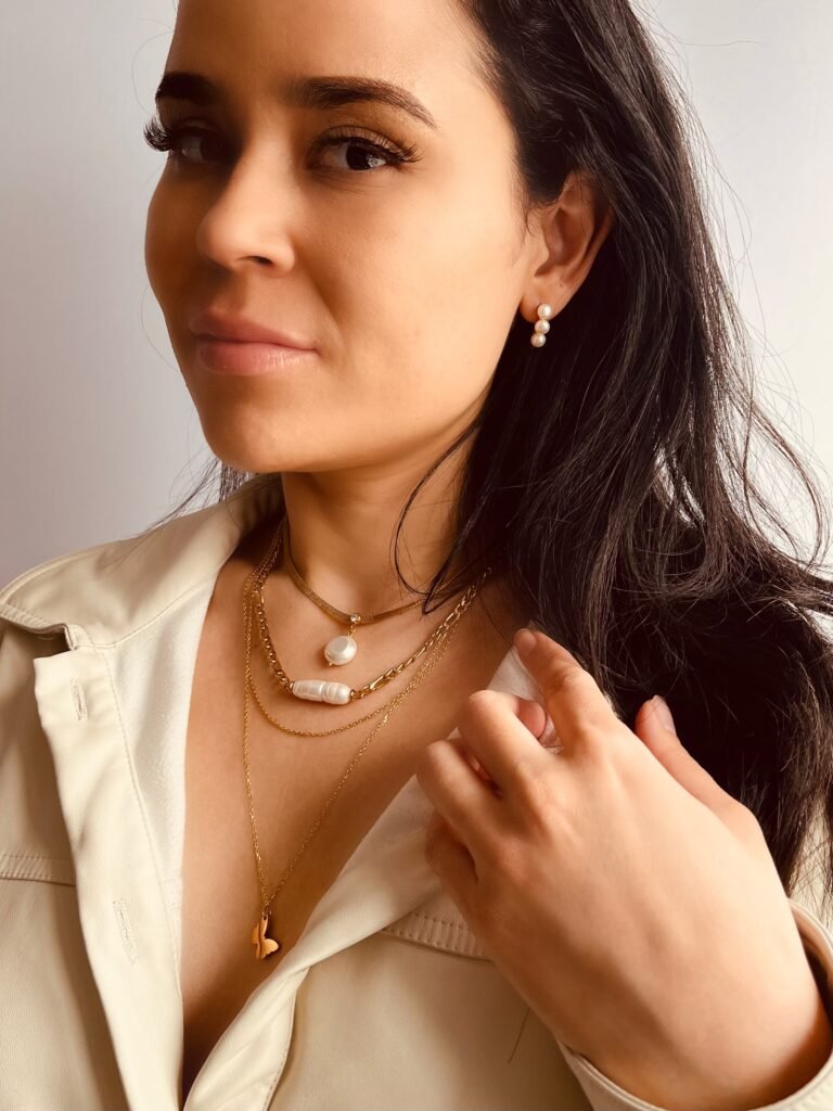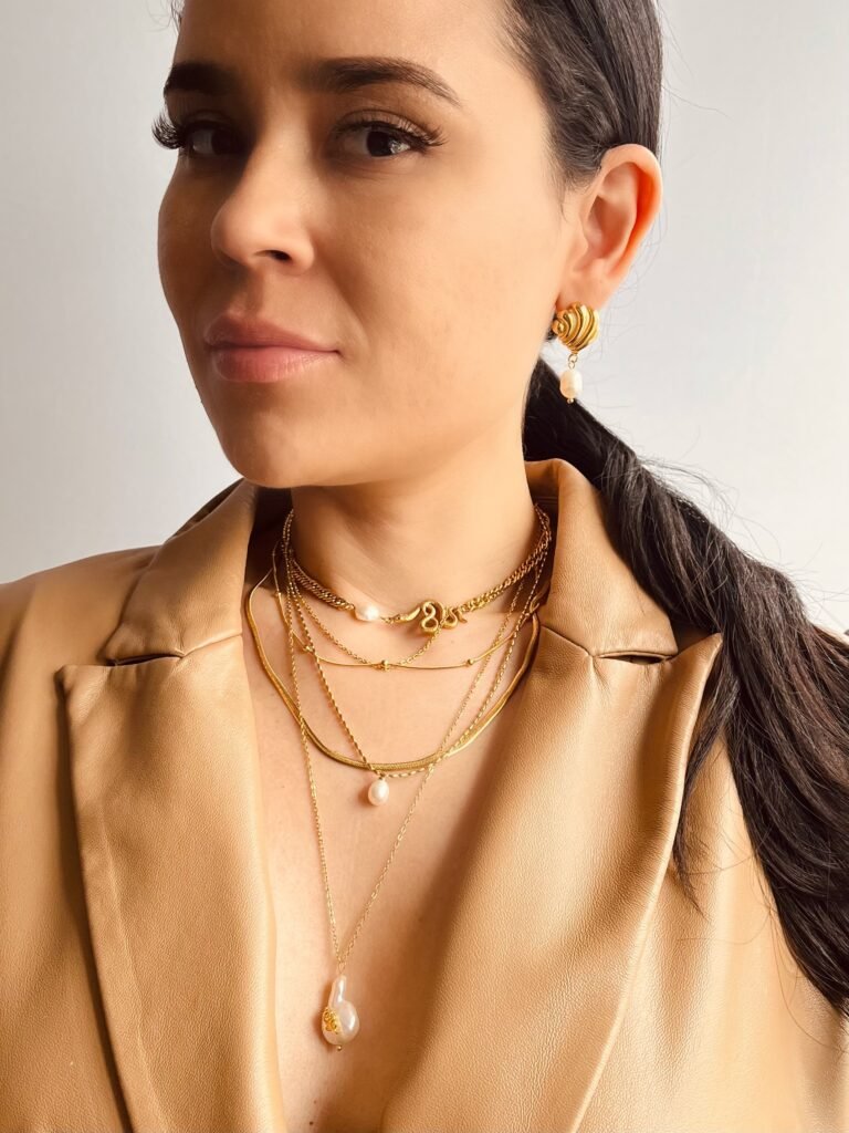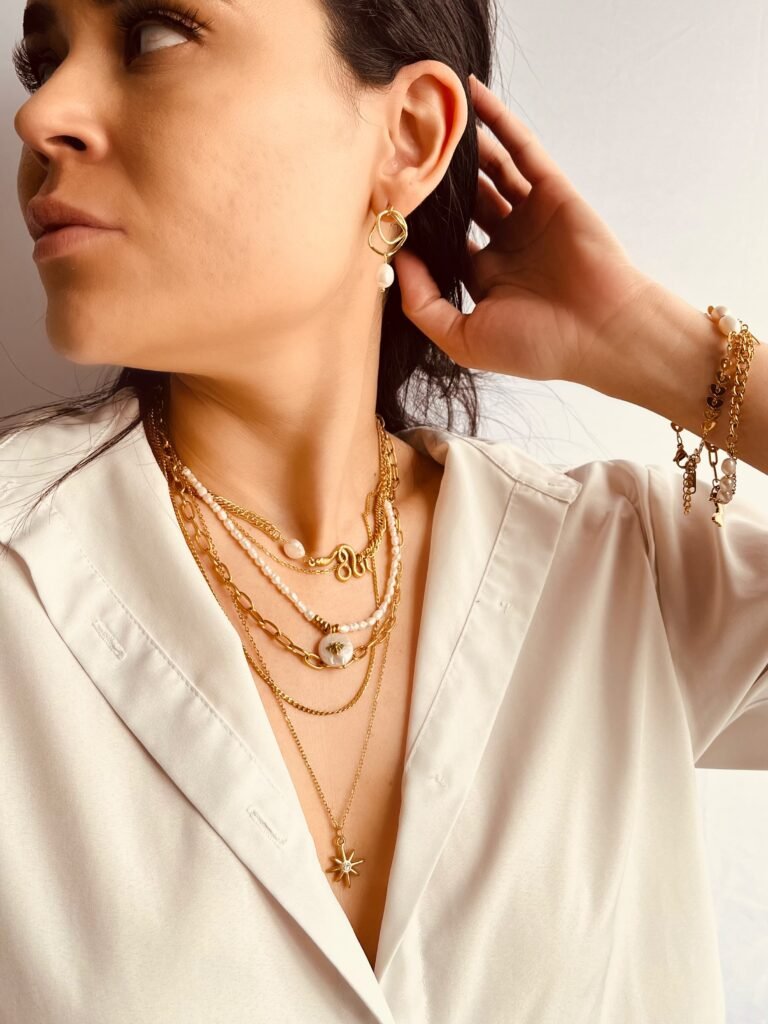7. Personalize with Charms, Pendants and Pearls: Add a personal touch to your layered necklace look by incorporating charms, pendants, or initials that hold special meaning to you. Whether it’s a pearl pendant, a vintage charm, or a symbol that represents something meaningful, these personalized touches can make your layered necklace ensemble truly unique to you.