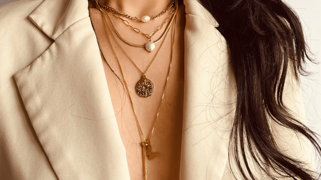 4. Mind the Space: Pay attention to the space between each necklace layer to ensure that they don’t tangle or overlap awkwardly. Aim for a slight variation in lengths between each necklace layer, allowing them to cascade gracefully down your neckline without becoming tangled or overshadowing one another.